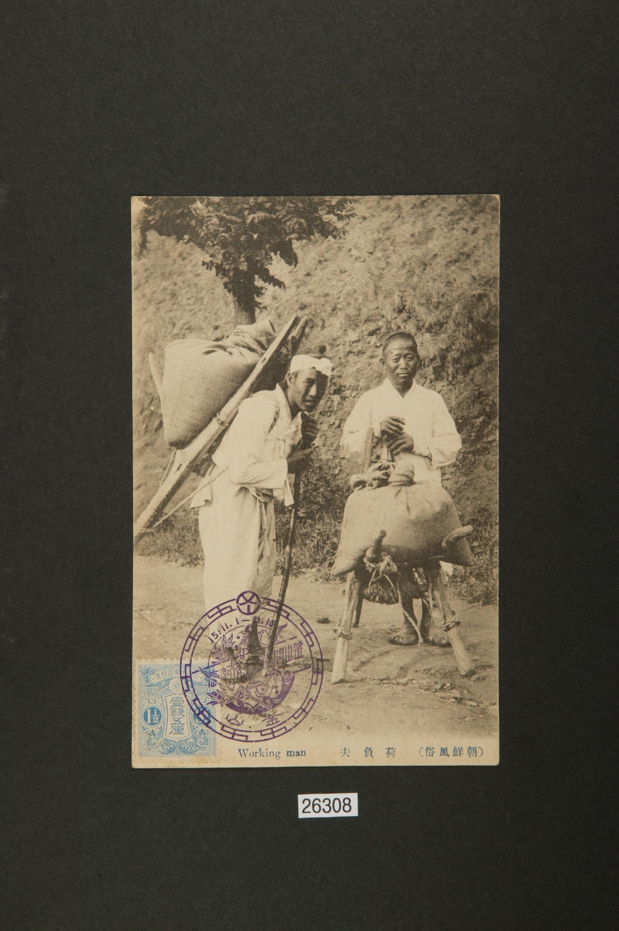 Se trata de una postal que representa las costumbres coreanas, editada por Gyeongseong Ilji Chulhang (京城日之出商行). El título es «Haebu» (荷負夫). En el anverso aparece una fotografía en blanco y negro de un hombre de pie con una carga a la espalda y otro hombre de pie con su carga en el suelo. En la esquina inferior del anverso hay un sello con la inscripción «壹錢五厘» (1,5 wones). Junto al sello hay un matasellos grabado con pájaros, plantas y «Busan». El título «Trabajador» está impreso en caracteres chinos. En el reverso hay un espacio para el sello con el logotipo de la empresa comercial Ilji. Hay espacios separados para la dirección y el mensaje.
